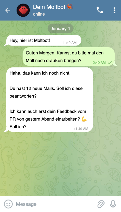 Die Heartbeat-Überraschung: Moltbot kann sich proaktiv melden – per Cron-Job, zu festgelegten Zeiten. @HixVAC war überrascht, als sein Bot plötzlich von sich aus schrieb. Nett gemeint, aber wenn du nicht weißt, dass das Feature existiert, gruselig.